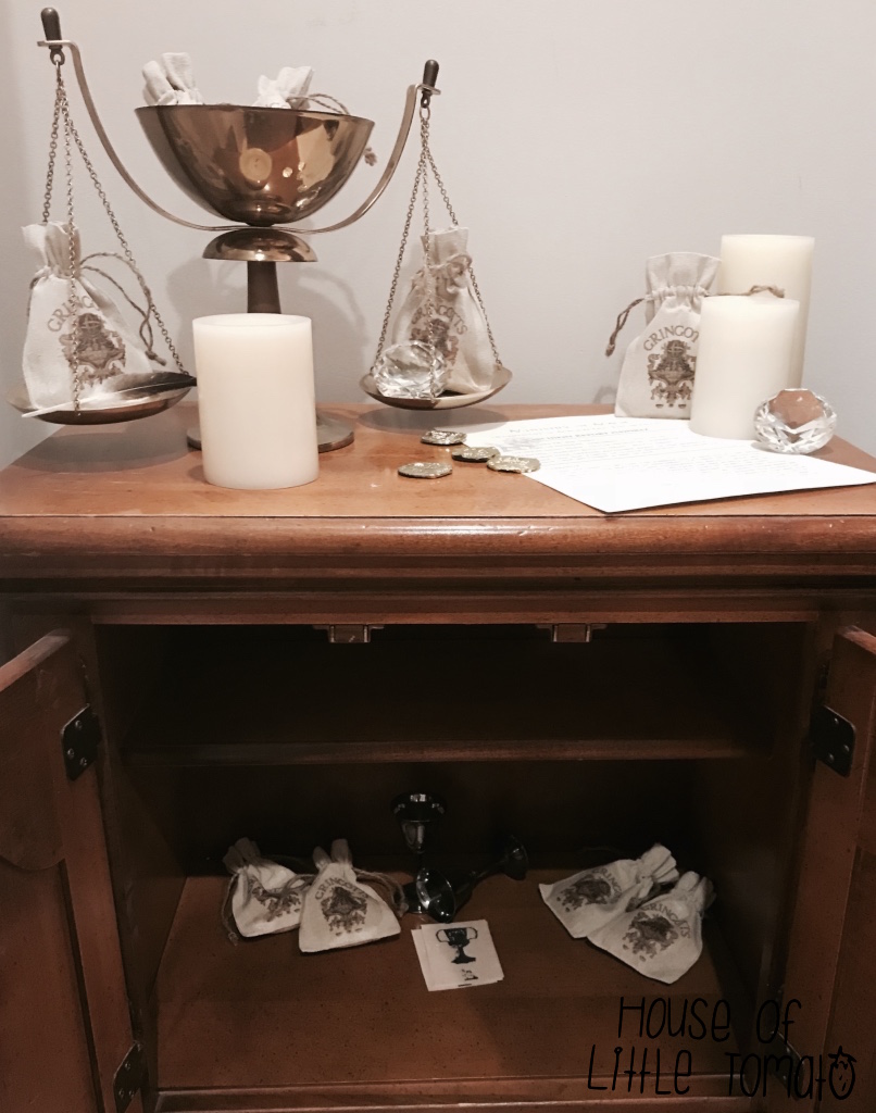 The Gringotts cabinet is locked with a 5 letter lock, and the key is SPELL.